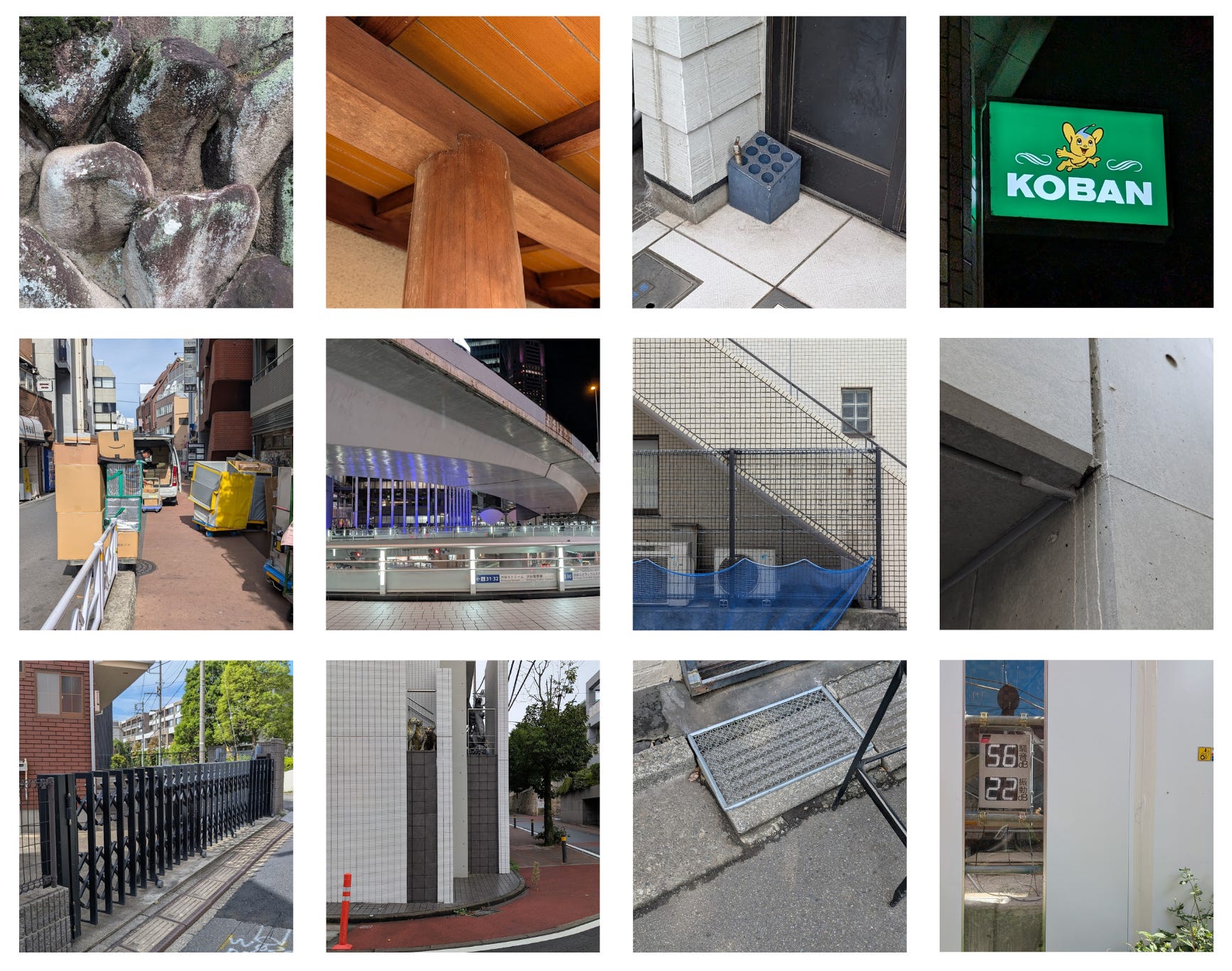 Row 1, L-R: A weird, bulbous way of building an interlocking stone wall; characteristically unlavish but careful and fine construction on a garage post; one of an endless series of umbrella holders outside houses and places of business; the flying fairybear logo of the Tokyo neighbourhood police posts.