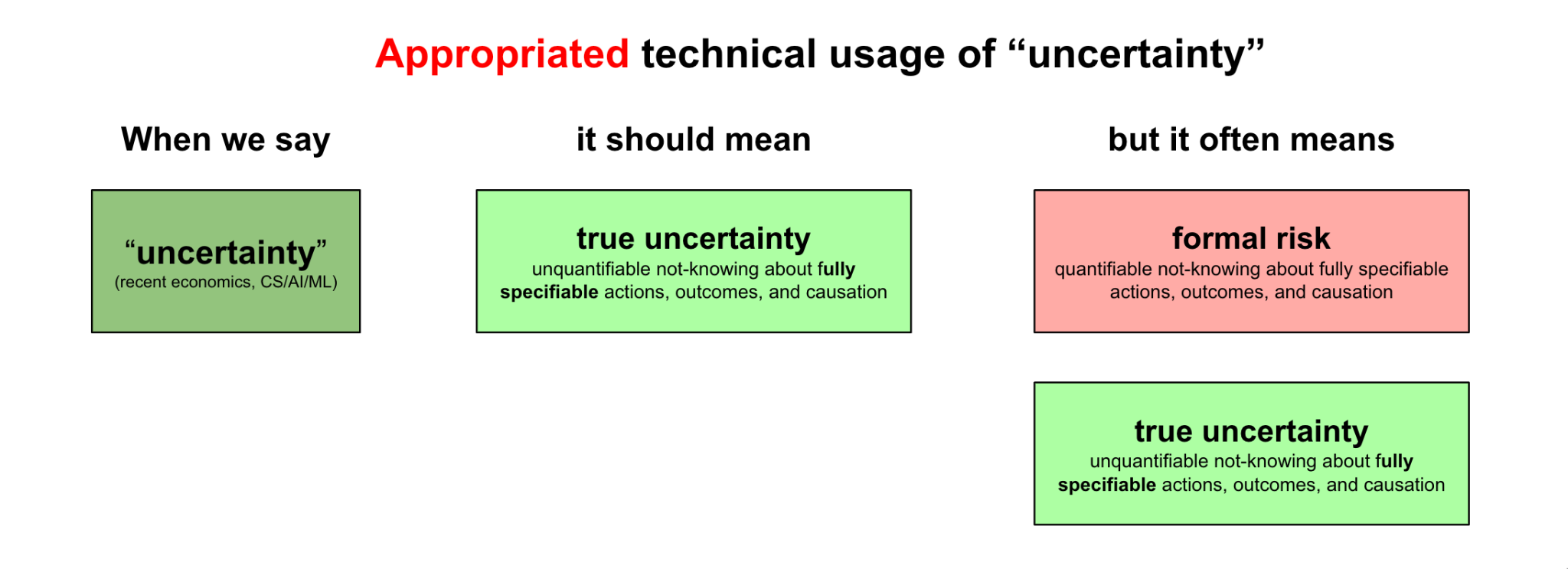 “Appropriation” here means using the word “uncertainty” in a way that does violence to its meaning as unquantifiable not-knowing about a situation (i.e., Knight’s definition). Knight’s definition for “uncertainty” should prevail here because his definition is completely non-overlapping with the definition for “formal risk” — and non-overlapping definitions help get us to clarity.