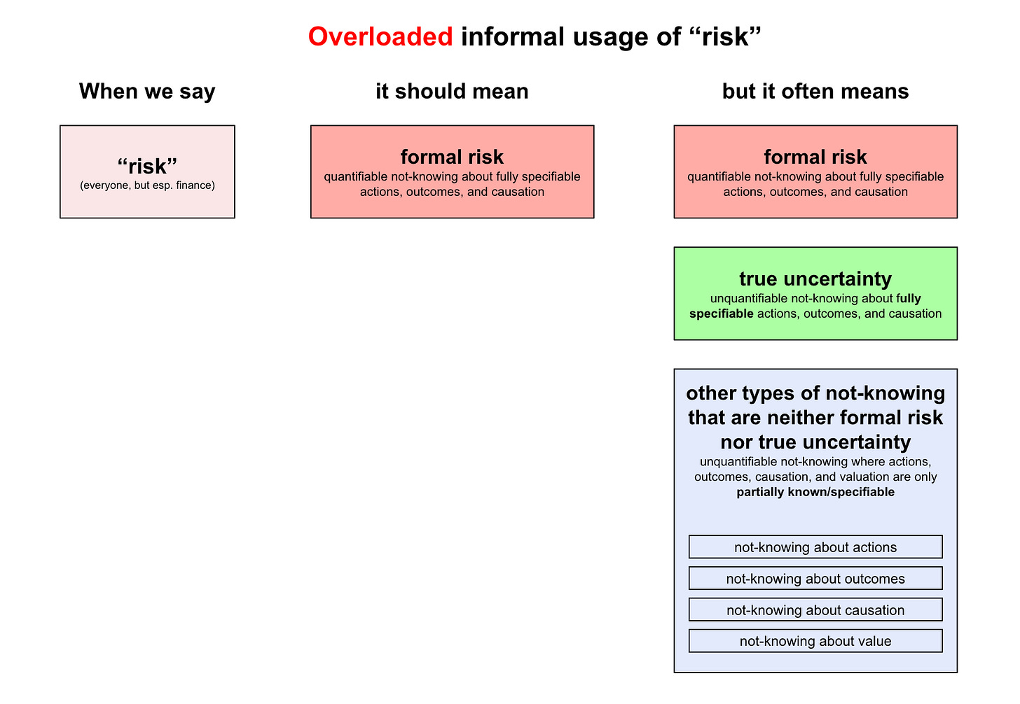 I’m using overloading in the same sense as in “function overloading” in software development, to mean a situation where different functions are all given the same name. This is what happens with the word “risk” in informal use. Nearly every real-world situation we call “risky” is actually a situation which isn’t formally risky. Instead it is a situation of non-risk not-knowing where formal risk conditions don't hold.