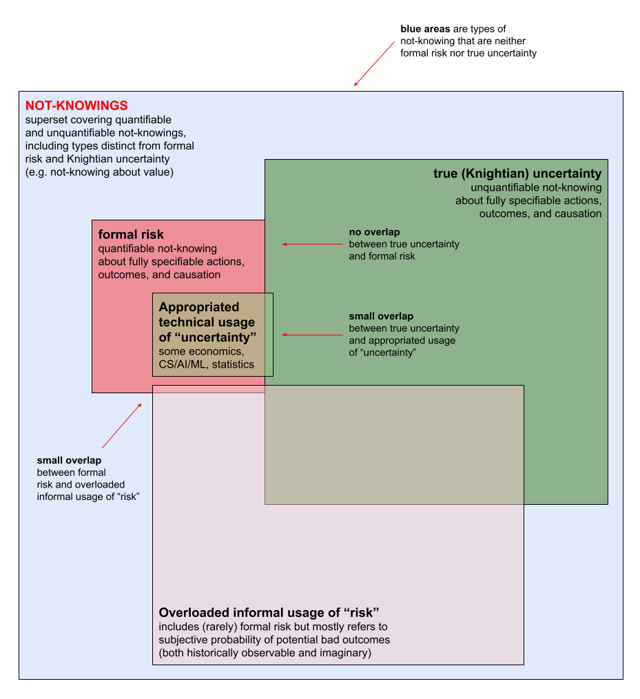 Appropriating “uncertainty” means using “uncertainty” to mean many things that all imply aspects of true uncertainty, but which resolve, when you look closely at how those terms are defined either explicitly or implicitly in use, to forms of not-knowing that are so restricted that they essentially constitute formal risk.False comfort two ways